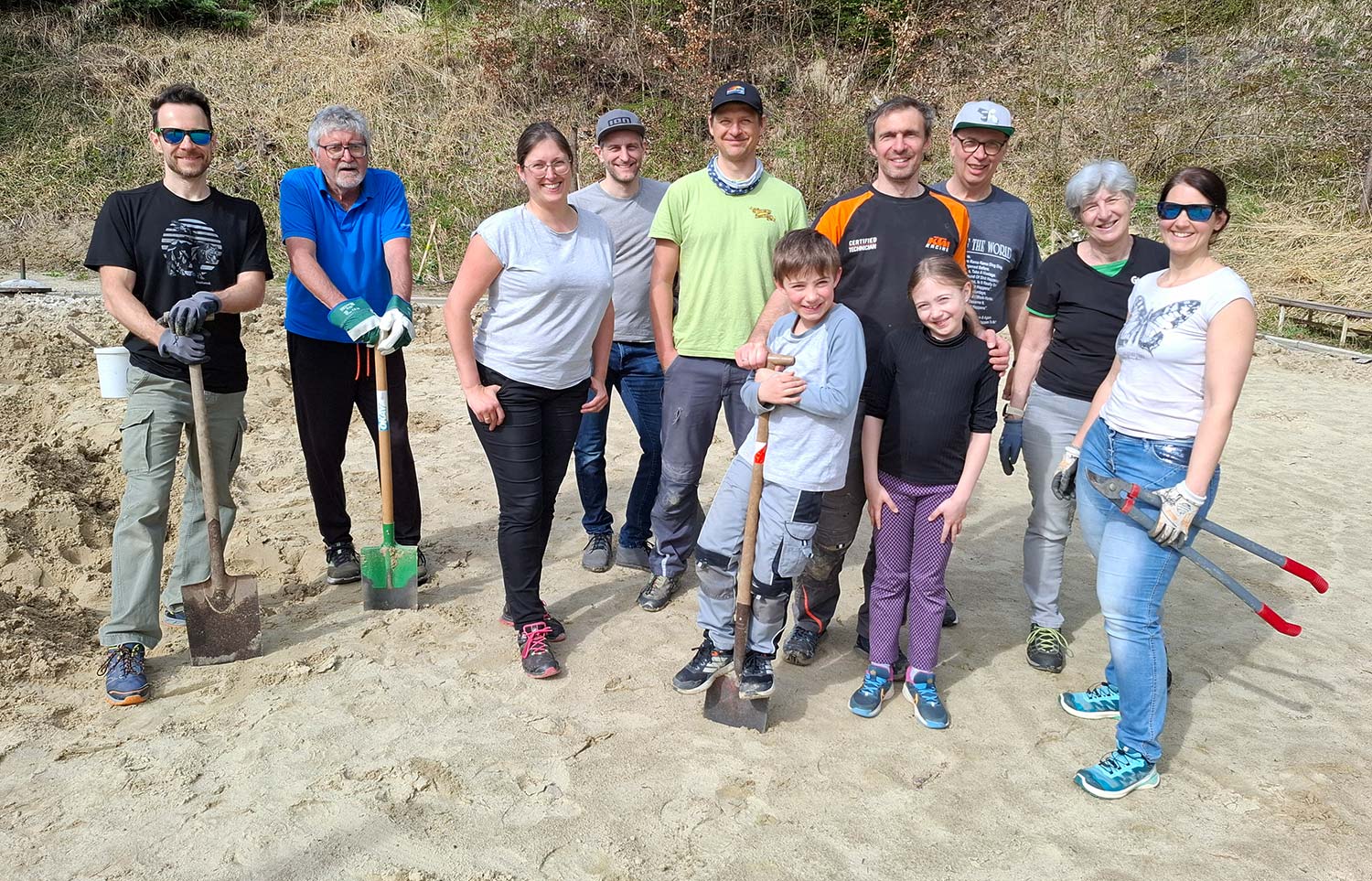 Am Samstag, 11. April, hieß es wieder die Beachplätze spielbereit zu machen: Unkraut ausgraben (Schachtelhalm!), den Bereich um die Plätze säubern, Sand angleichen, Linien einmessen und Netze montieren.